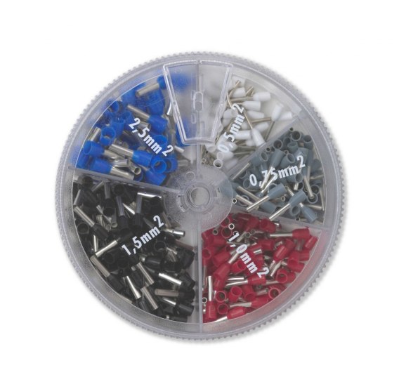 ZESTAW KOŃCÓWEK TULEJKOWYCH IZOLOWANYCH W PLASTIKOWYM PUDEŁKU, (50X0.5/8 BIAŁE, 100X0.75/8 SZARE, 100X1/8 CZERWONA, 100X1.5/8 CZARNE, 50X2.5/8 NIEBIESKIE) MODEL BM00421