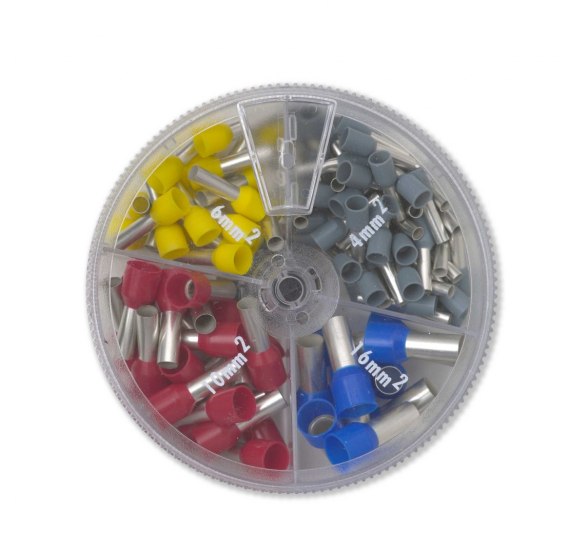 ZESTAW KOŃCÓWEK TULEJKOWYCH IZOLOWANYCH W PLASTIKOWYM PUDEŁKU, (50X4/10 SZARE, 20X6/12 ŻÓŁTE, 20X10/12 CZERWONA, 10X16/12 NIEBIESKIE) MODEL BM00422